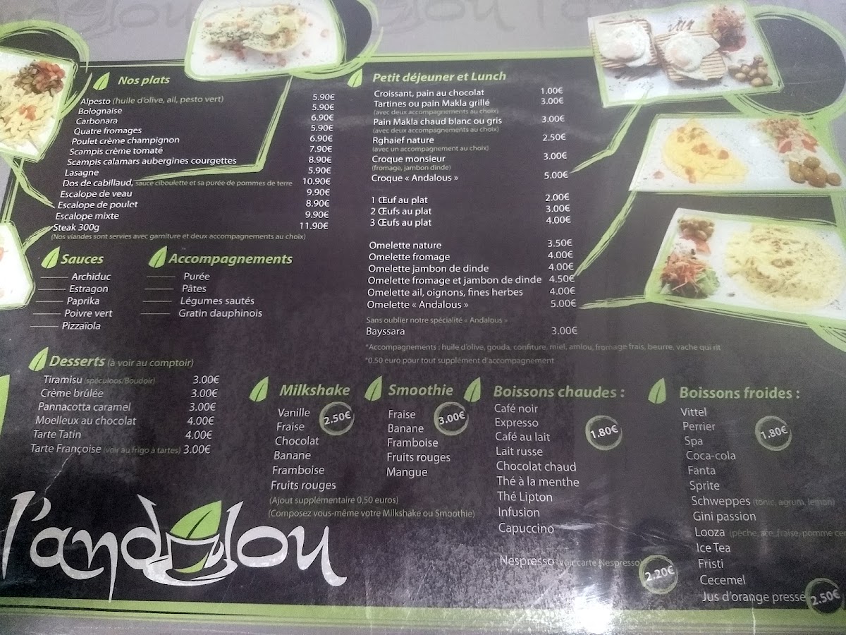 The menu at L'andalou offers a selection designed to suit various times of the day, including breakfast options and beverages. Visitors can expect a range of coffee and tea selections, with Moroccan tea noted as a particular option. The food offerings primarily focus on light meals suitable for breakfast or casual dining.